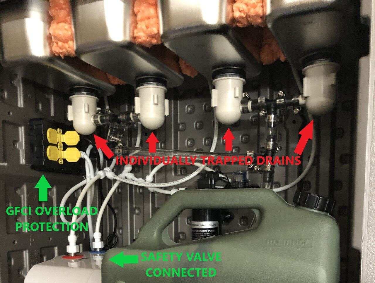 Pre-plumbed vinyl tubing and chemical-resistant drain traps ease the flow of graywater and other liquids out of the basins and into the wastewater tank located in the cabinet below. This metal-reinforced cabinet also houses the electric pump, water heater, freshwater tank, and wastewater tank.